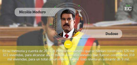 También subrayó la construcción de viviendas. En este punto, las cifras ofrecidas fueron contradictorias. Para 2015 el Presidente refirió que su Gobierno había construido 326 mil 323 viviendas en 2015, las que, junto con las construidas en años anteriores, sumaban el millón. En 2016, la construcción de viviendas alcanzó las 359 mil, pero el total es de un millón 350 mil viviendas, lo que deja por fuera 9 mil viviendas del total anunciado.